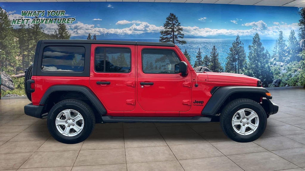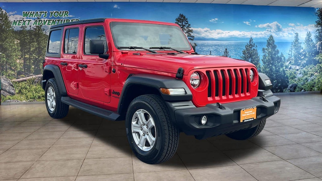 TRANSMISSION: 8-SPEED AUTOMATIC (850RE) Anti-Lock 4-Wheel Disc Brakes, Tip Start, Dana M200 Rear Axle, Selec-Speed Control, QUICK ORDER PACKAGE 25S SPORT S Engine: 3.6L V6 24V VVT eTorque UPG I, Transmission: 8-Speed Automatic (850RE), Front 1-Touch Down Power Windows, Speed Sensitive Power Locks, Sport S, Power Heated Mirrors, Automatic Headlamps, Leather Wrapped Steering Wheel, Security Alarm, Remote Keyless Entry, Sun Visors w/Illuminated Vanity Mirrors, BLACK 3-PIECE HARD TOP Freedom Panel Storage Bag, Rear Window Defroster, Rear Window Wiper/Washer, No Soft Top, TRAILER TOW & HD ELECTRICAL GROUP Class II Receiver Hitch, 700 Amp Maintenance Free Battery, 7 & 4 Pin Wiring Harness, 240 Amp Alternator, Auxiliary Switches, ENGINE: 3.6L V6 24V VVT ETORQUE UPG I 600 Amp Maintenance Free Battery, 48V Belt Starter Generator, GVWR: 5,460 lbs, Delete Alternator. Jeep Unlimited Sport S with Firecracker Red Clearcoat exterior and Black interior features a V6 Cylinder Engine with 285 HP at 6400 RPM*.