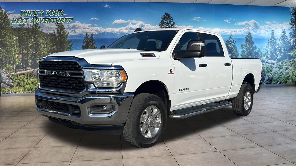 ENGINE: 6.7L I6 CUMMINS TURBO DIESEL Selective Catalytic Reduction (Urea), Dual 730 Amp Maintenance Free Batteries, Cummins Turbo Diesel Badge, Heavy Duty Engine Cooling, Tow Hooks, Diesel Exhaust Brake, Supplemental Heater, Front Bumper Sight Shields, Capless Fuel Fill w/o Discriminator, DIESEL GRAY/BLACK, PREMIUM CLOTH 40/20/40 BENCH SEAT Storage Tray, Rear 60/40 Folding Seat, Front Armrest w/Cupholders, Remote USB Port - Charge Only, Front Center Seat Cushion Storage, Manual Adjust 4-Way Front Passenger Seat, Power Adjust 8-Way Driver Seat, Front Seat Back Map Pockets, Power 2-Way Driver Lumbar Adjust, CHROME FLAT CAB-LENGTH SIDE STEPS, LEVEL 1 EQUIPMENT GROUP Google Android Auto®, For Details, Visit DriveUconnect.com, For More Info, Call 800-643-2112, Leather Wrapped Steering Wheel, Rear Dome w/On/Off Switch Lamp, Front Fog Lamps, Glove Box Lamp, Auto Power-Folding Mirrors, Footwell Courtesy Lamp, 4G LTE Wi-Fi Hot Spot, Mirror Running Lights, Radio: Uconnect 5 W w/8.4 Display, 8.4 Touchscreen Display, Foam Bottle Insert (Door Trim Panel), Wheels: 18 x 8.0 Polished Aluminum, Apple CarPlay®, Big Horn IP Badge, Power Adjustable Convex Aux Mirrors, Forward & Reverse Utility Lights, Locking Lower Glove Box, Selectable Tire Fill Alert, SiriusXM Satellite Radio, Power Heated Fold Telescope Mirrors, Exterior Mirrors w/Supplemental Signals, Steering Wheel Mounted Audio Controls, Exterior Mirrors Courtesy Lamps, Dual Glove, TRANSMISSION: 6-SPEED AUTOMATIC (68RFE). Ram Big Horn with Bright White Clearcoat exterior and Diesel Gray/Black interior features a Straight 6 Cylinder Engine with 410 HP at 5600 RPM*.