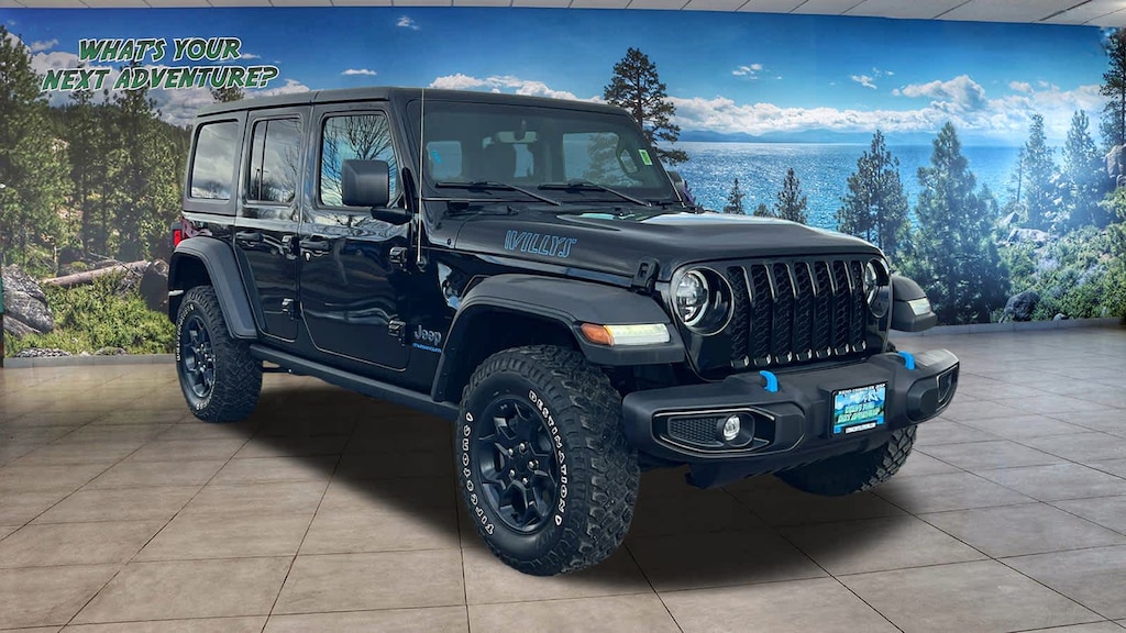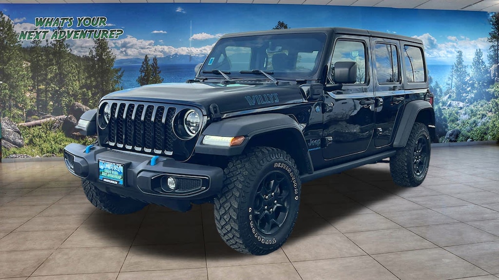 BLACK 3-PIECE HARD TOP Freedom Panel Storage Bag, Rear Window Defroster, Rear Window Wiper/Washer, 8.4 RADIO GROUP Off-Road Info Pages, SiriusXM Traffic Plus, HD Radio, Radio: Uconnect 4C Nav w/8.4 Display, For Details, Visit DriveUconnect.com, Rear View Auto Dim Mirror, 1-Year SiriusXM Guardian Trial, GPS Navigation, SiriusXM Travel Link, Emergency/Assistance Call, 8.4 Touchscreen Display, QUICK ORDER PACKAGE 29W WILLYS Engine: 2.0L I4 DOHC DI Turbo PHEV, Transmission: 8-Speed Auto 8P75PH PHEV, Willys, 4xe 4-Wheel Drive Swing Gate Decal, Willys 4xe Hood Decal, Black Grille, MOPAR All-Weather Floor Mats, Rock Protection Sill Rails, 97 MPH Vehicle Max Speed Calibration, Anti-Spin Differential Rear Axle, Molded-In-Color Fender Flares (2-Piece), Front LED Fog Lamps, LED Premium Reflector Headlamps, LED Headlamp & Fog Lamp Group, TRANSMISSION: 8-SPEED AUTO 8P75PH PHEV (STD), ENGINE: 2.0L I4 DOHC DI TURBO PHEV (STD). Jeep Wrangler 4xe with Black Clearcoat exterior and Black interior features a 4 Cylinder Engine with 375 HP at 5250 RPM*.