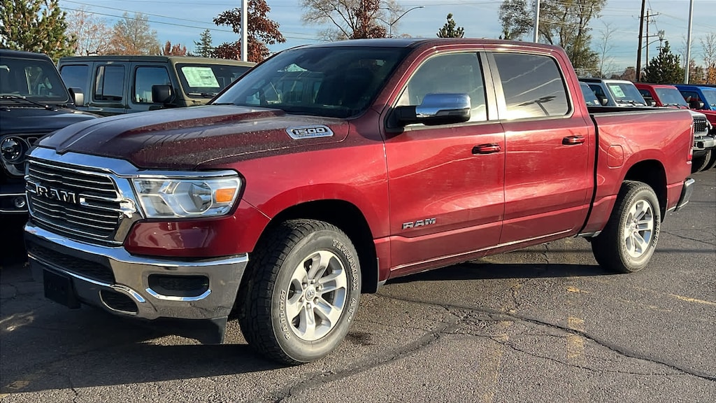 ENGINE: 5.7L V8 HEMI MDS VVT ETORQUE Active Noise Control System, Heavy Duty Engine Cooling, Passive Tuned Mass Damper, GVWR: 7,100 lbs, Dual Rear Exhaust w/Bright Tips, HEMI Badge, 23 Gallon Fuel Tank, 18 Aluminum Spare Wheel, CLASS IV RECEIVER HITCH, TRANSMISSION: 8-SPEED AUTOMATIC (8HP75). Ram Laramie with Delmonico Red Pearlcoat exterior and Black interior features a 8 Cylinder Engine with 395 HP at 5600 RPM*.